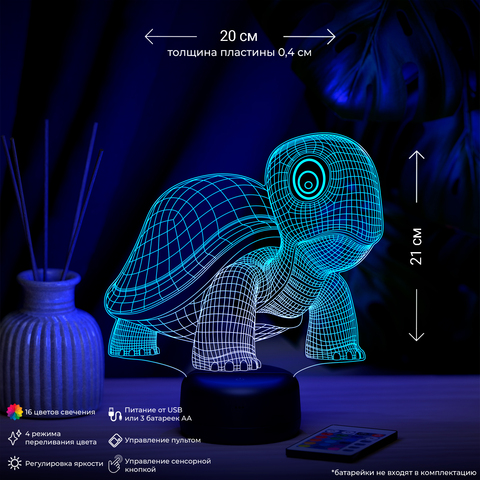 Питание: 3Д-Светильник работает от 3-х батареек АА или от USB провода. Возможна доукомплектация адаптером питания от сети 220V