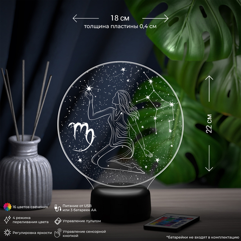 Цвета свечения: ночники имеют 16 разных режимов подсветки, регулировку яркости и 4 режима переливания цвета. Управление режимами подсветки осуществляется с помощью пульта дистанционного управления, а также прикосновением к сенсорной панели на основании светильника.