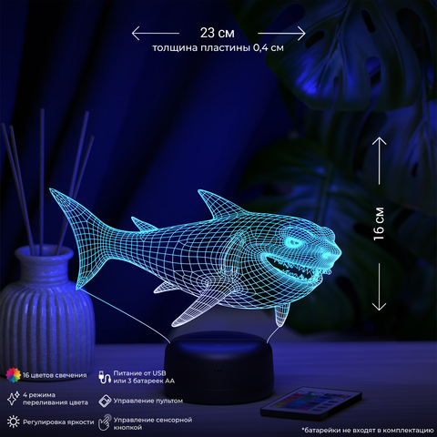 Питание: 3Д-Светильник работает от 3-х батареек АА или от USB провода. Возможна доукомплектация адаптером питания от сети 220V