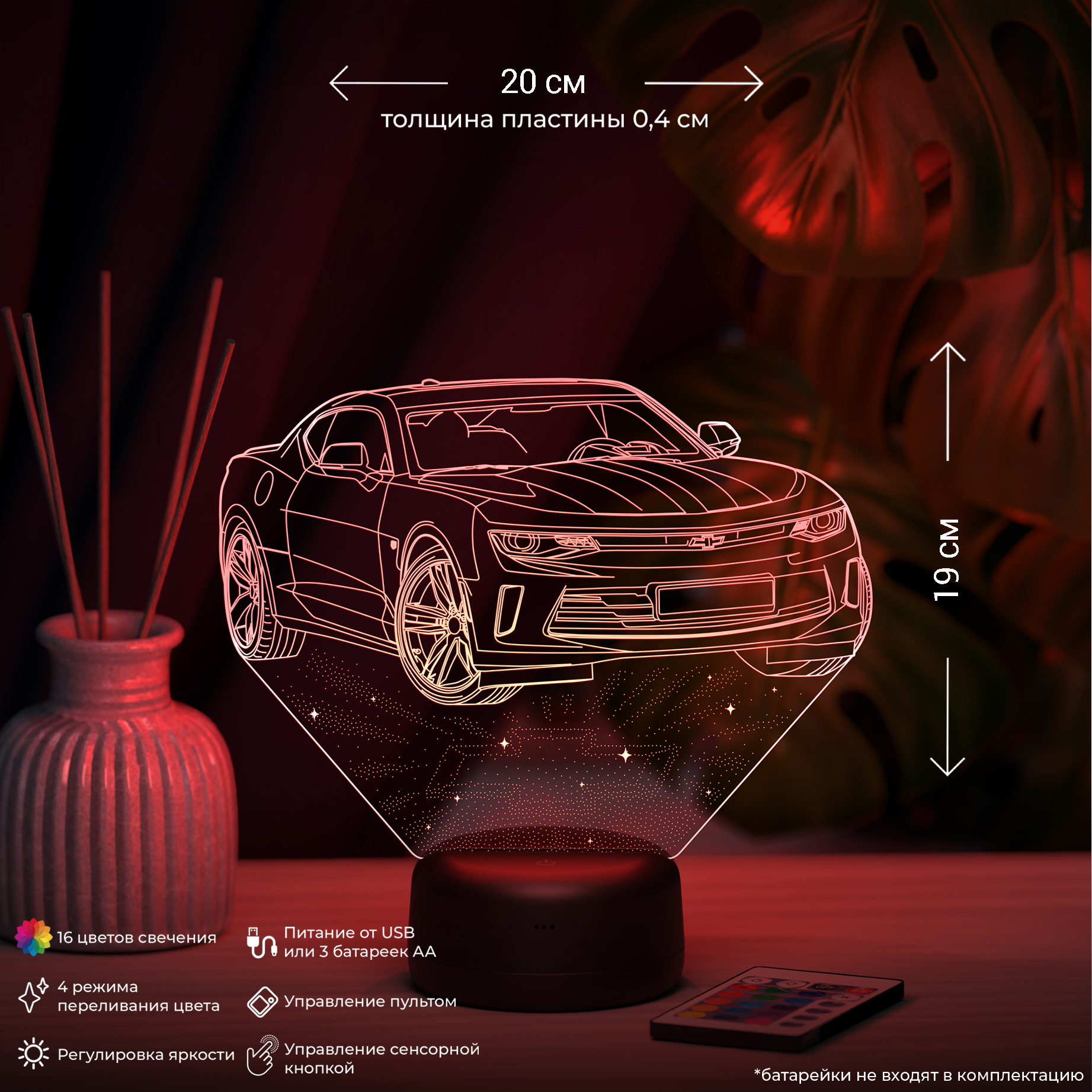 Питание: 3Д-Светильник работает от 3-х батареек АА или от USB провода. Возможна доукомплектация адаптером питания от сети 220V