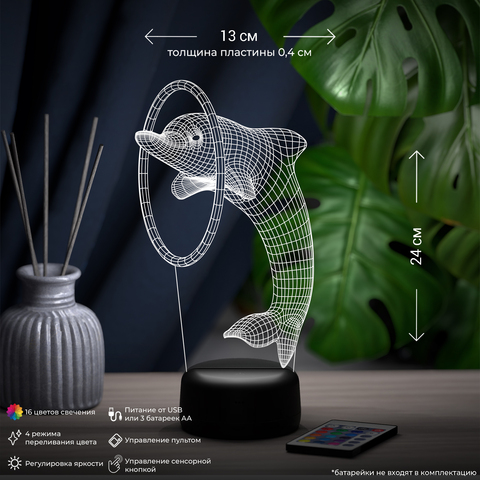 Питание: 3Д-Светильник работает от 3-х батареек АА или от USB провода. Возможна доукомплектация адаптером питания от сети 220V