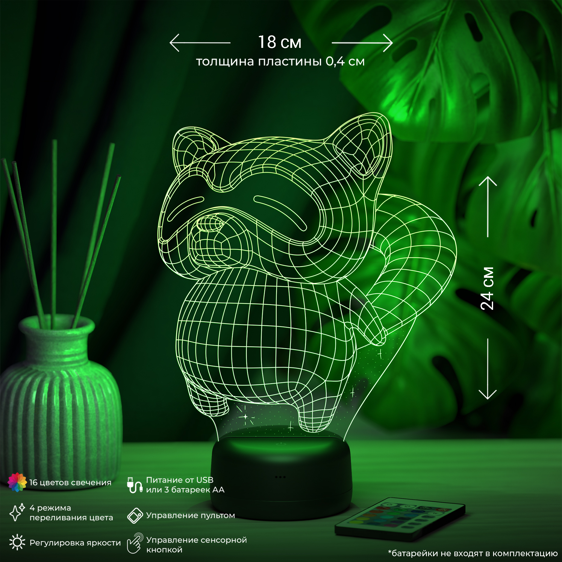 Питание: 3Д-Светильник работает от 3-х батареек АА или от USB провода. Возможна доукомплектация адаптером питания от сети 220V