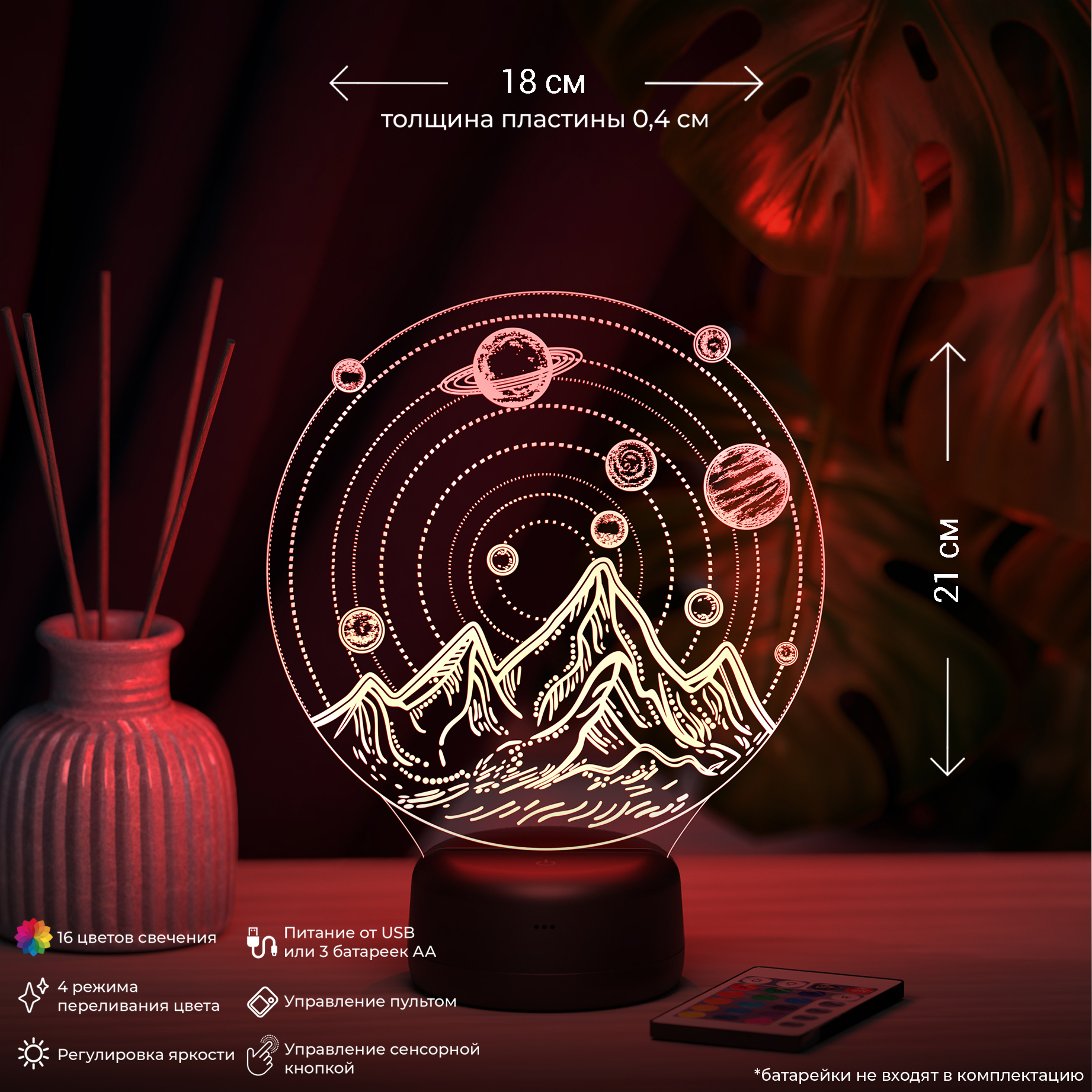 Питание: 3Д-Светильник работает от 3-х батареек АА или от USB провода. Возможна доукомплектация адаптером питания от сети 220V