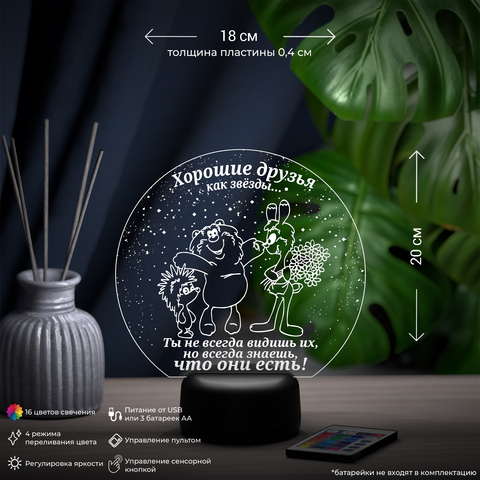 Питание: 3Д-Светильник работает от 3-х батареек АА или от USB провода. Возможна доукомплектация адаптером питания от сети 220V