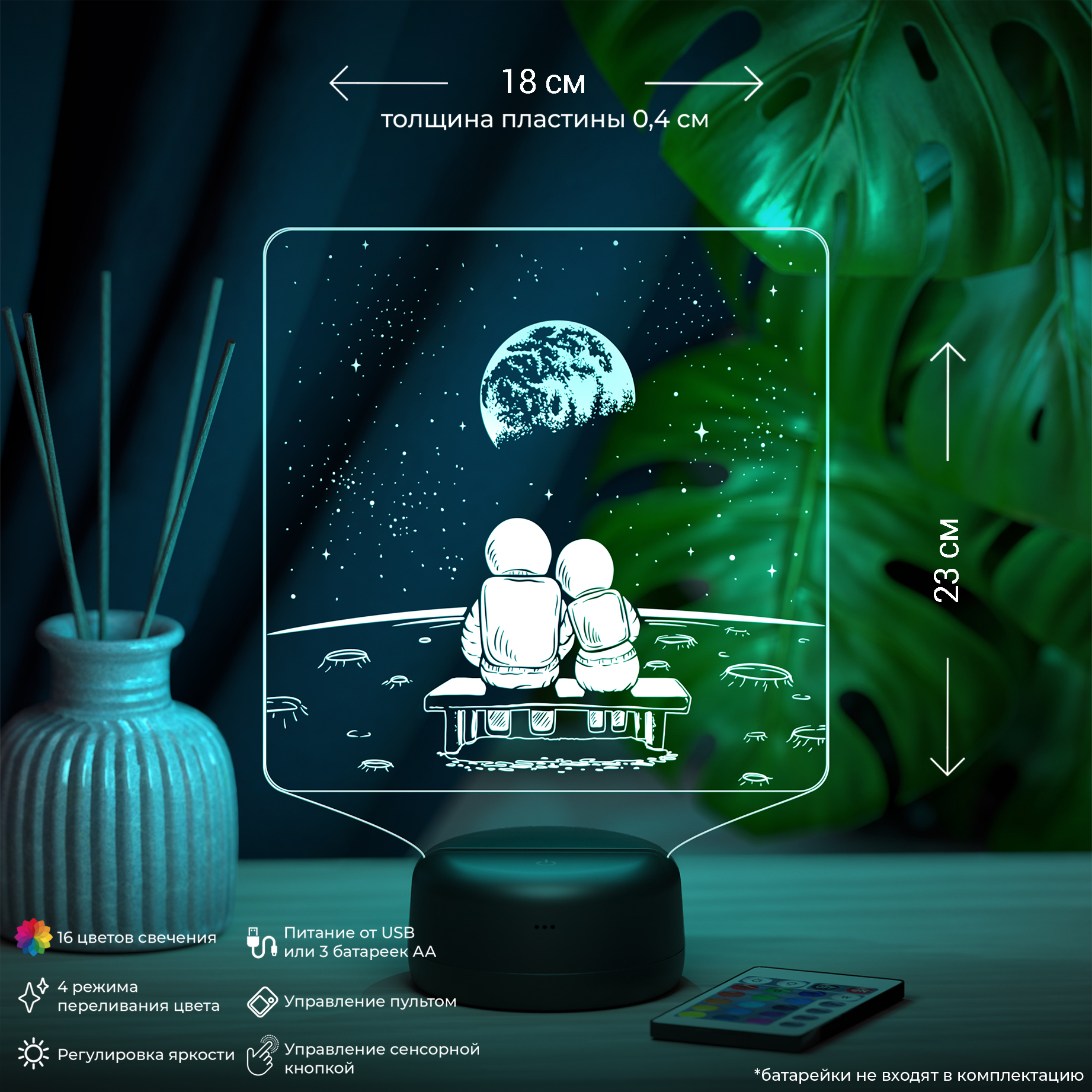 Питание: 3Д-Светильник работает от 3-х батареек АА или от USB провода. Возможна доукомплектация адаптером питания от сети 220V