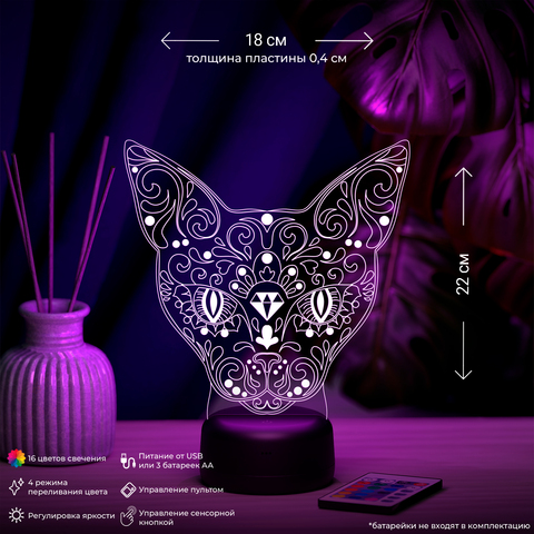 Питание: 3Д-Светильник работает от 3-х батареек АА или от USB провода. Возможна доукомплектация адаптером питания от сети 220V