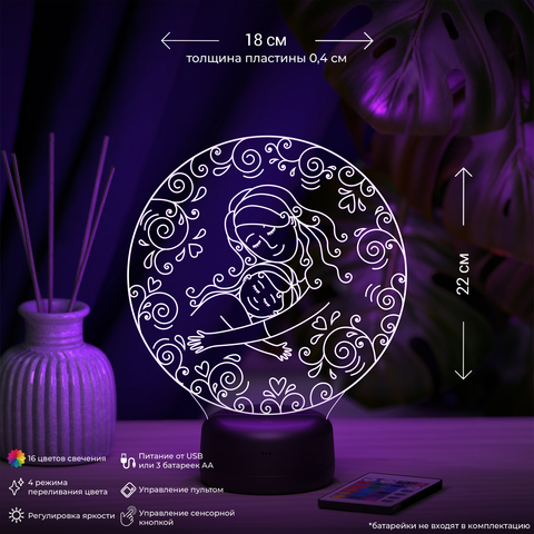 Питание: 3Д-Светильник работает от 3-х батареек АА или от USB провода. Возможна доукомплектация адаптером питания от сети 220V
