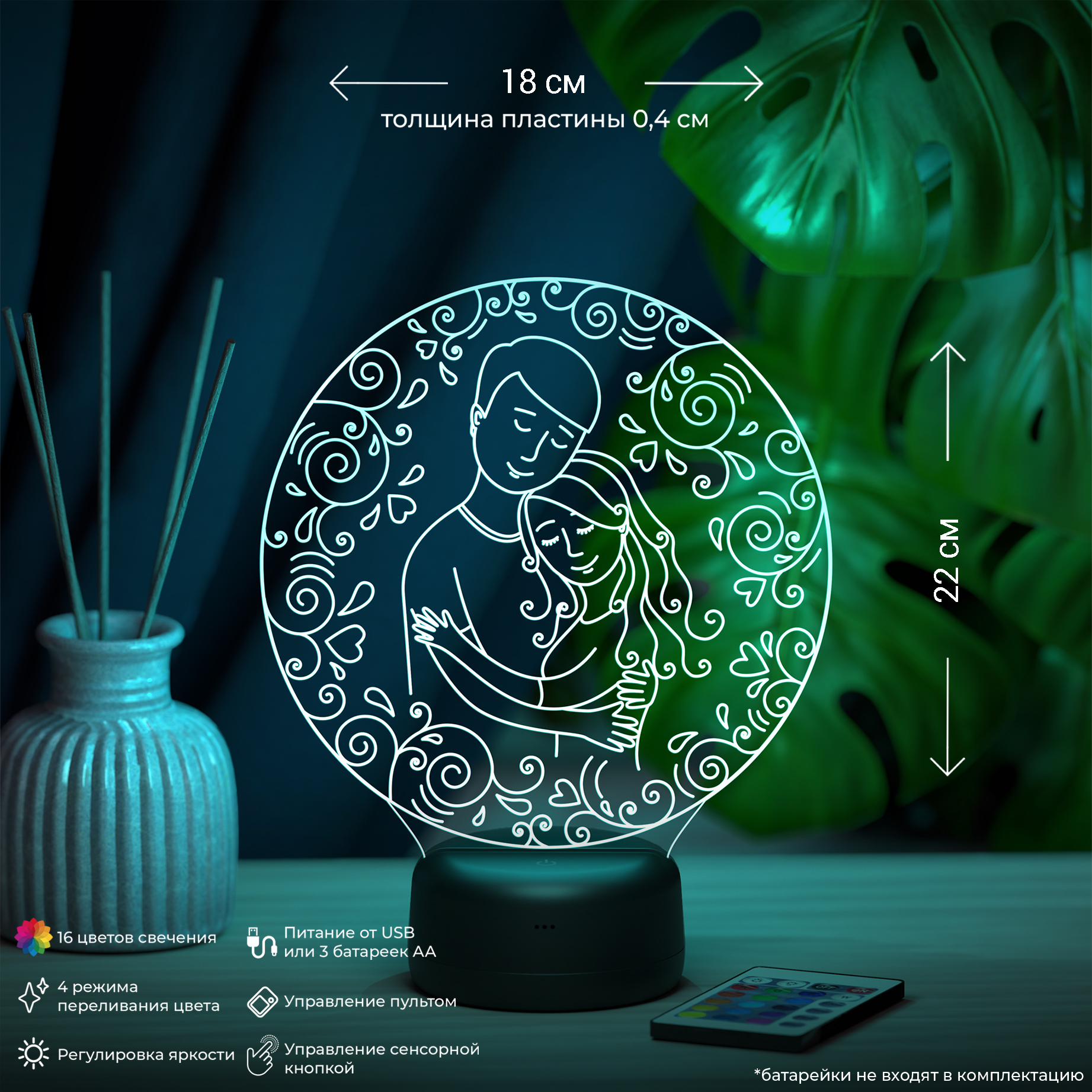 Питание: 3Д-Светильник работает от 3-х батареек АА или от USB провода. Возможна доукомплектация адаптером питания от сети 220V