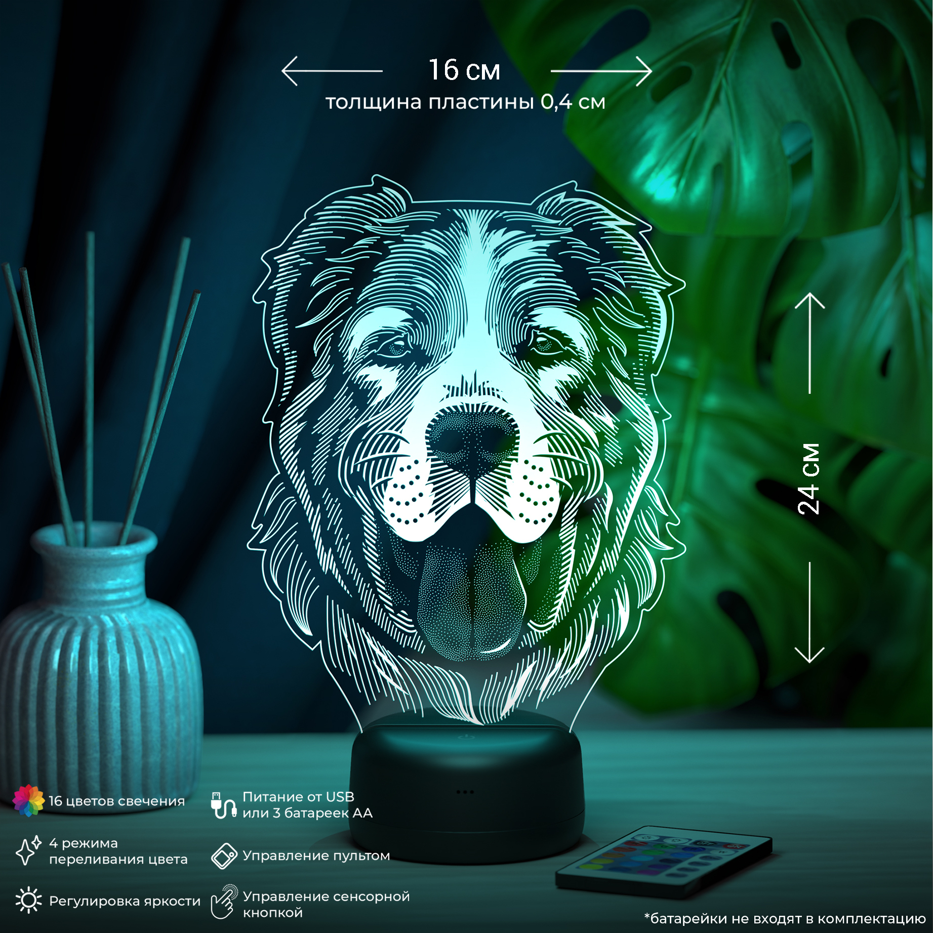 Питание: 3Д-Светильник работает от 3-х батареек АА или от USB провода. Возможна доукомплектация адаптером питания от сети 220V