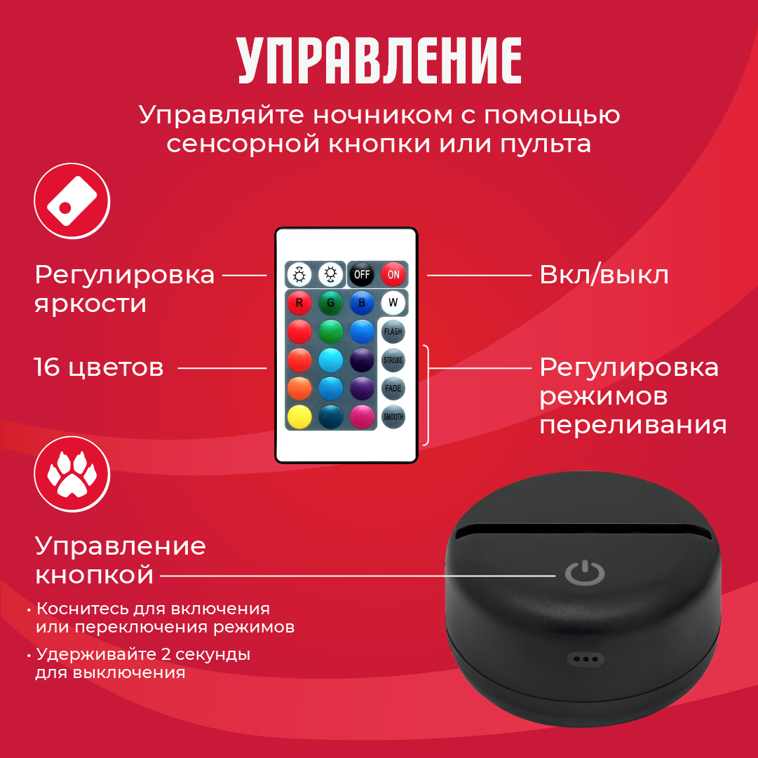 Цвета свечения: ночники имеют 16 разных режимов подсветки, регулировку яркости и 4 режима переливания цвета. Управление режимами подсветки осуществляется с помощью пульта дистанционного управления, а также прикосновением к сенсорной панели на основании светильника.