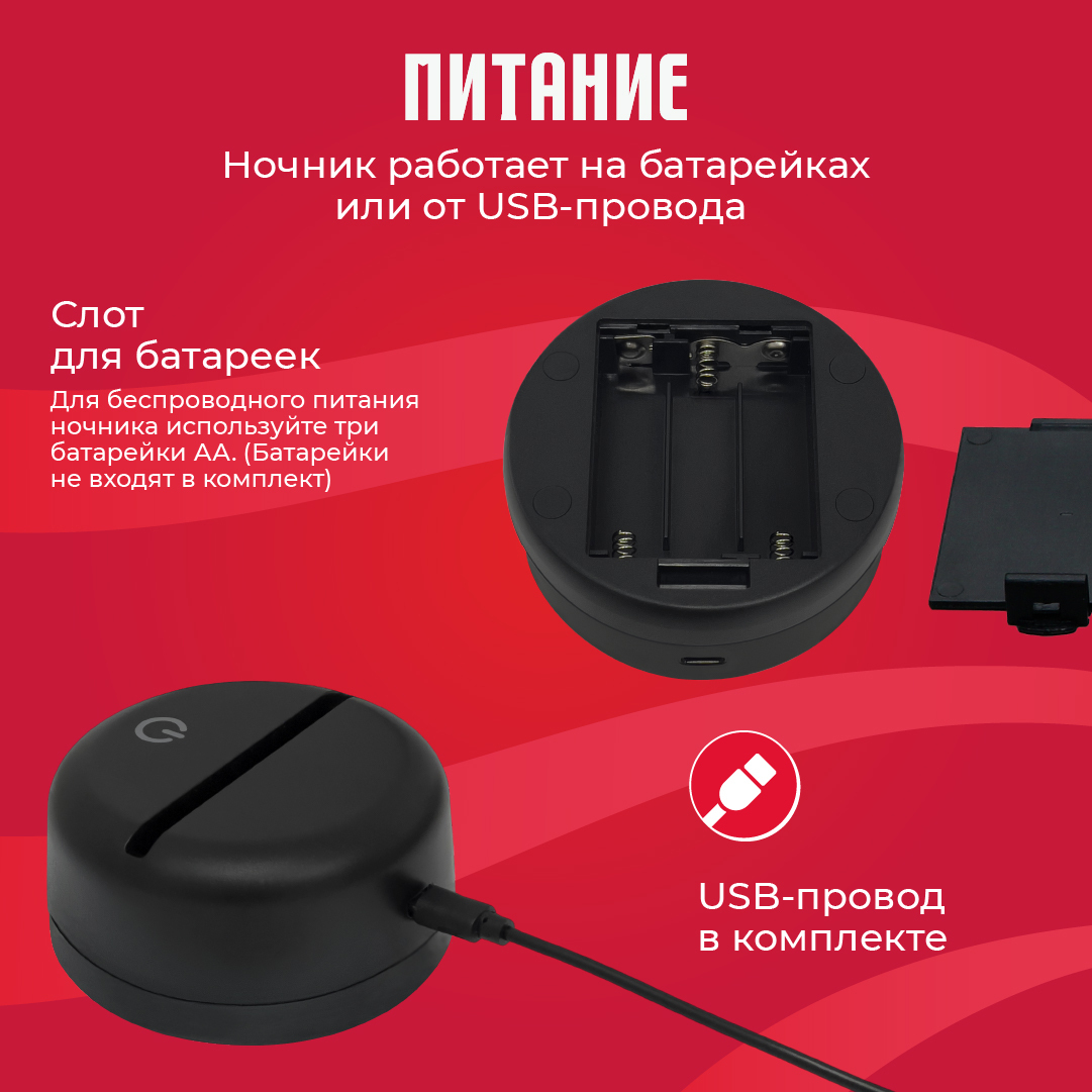 Питание: 3Д-Светильник работает от 3-х батареек АА или от USB провода. Возможна доукомплектация адаптером питания от сети 220V