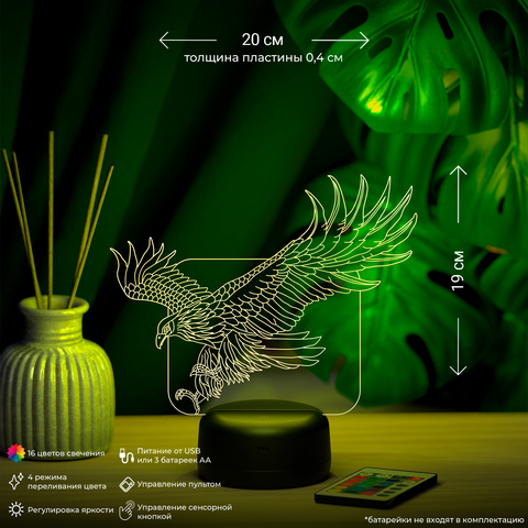Питание: 3Д-Светильник работает от 3-х батареек АА или от USB провода. Возможна доукомплектация адаптером питания от сети 220V