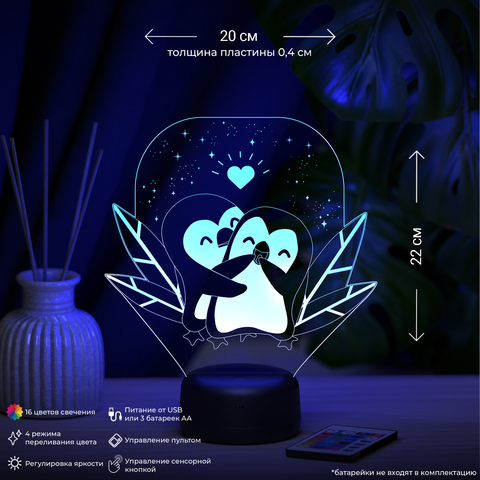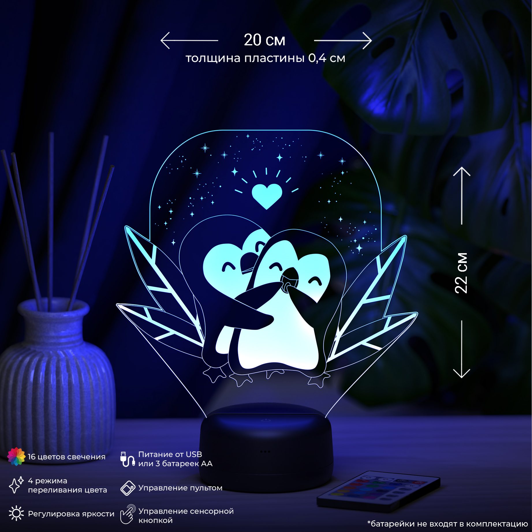 Питание: 3Д-Светильник работает от 3-х батареек АА или от USB провода. Возможна доукомплектация адаптером питания от сети 220V