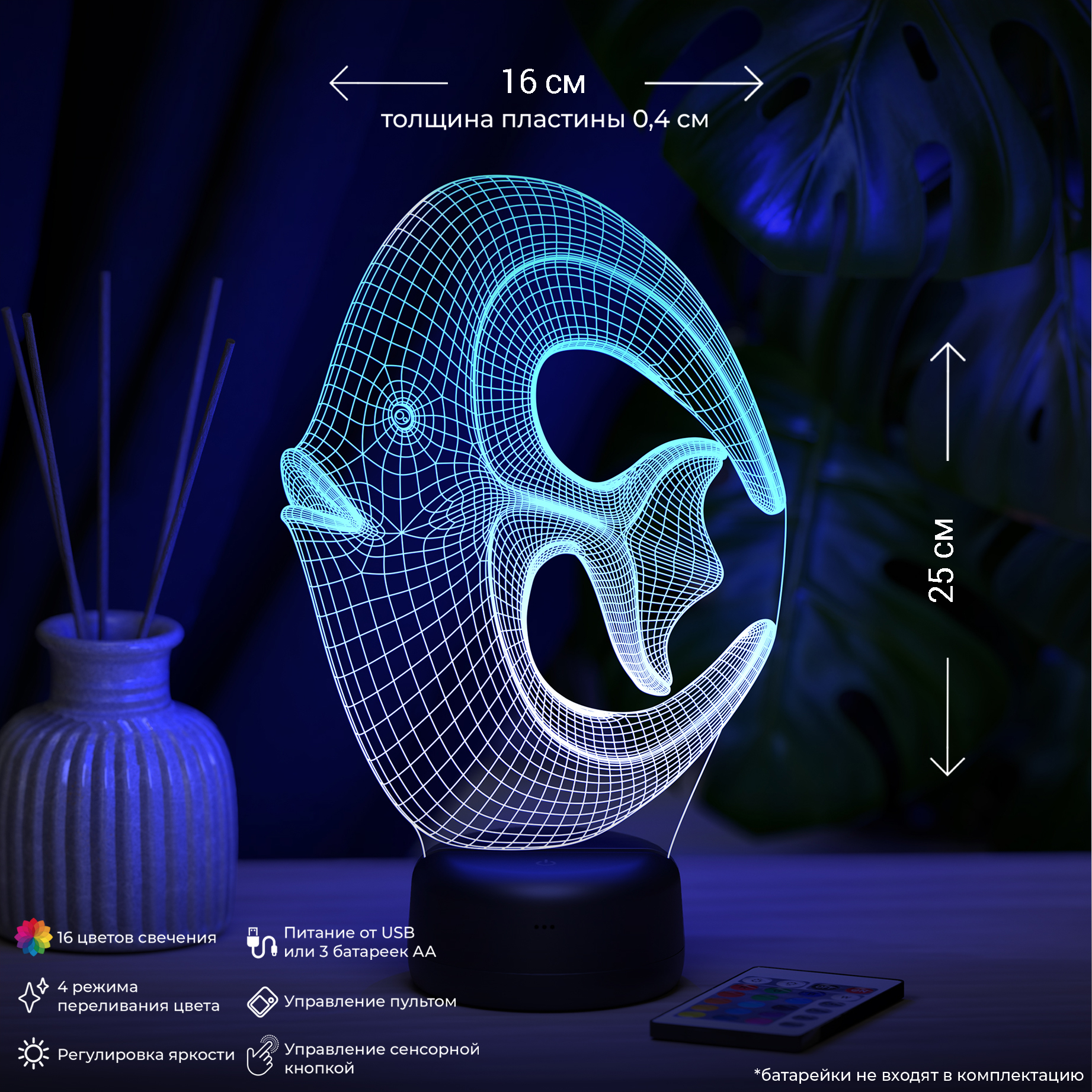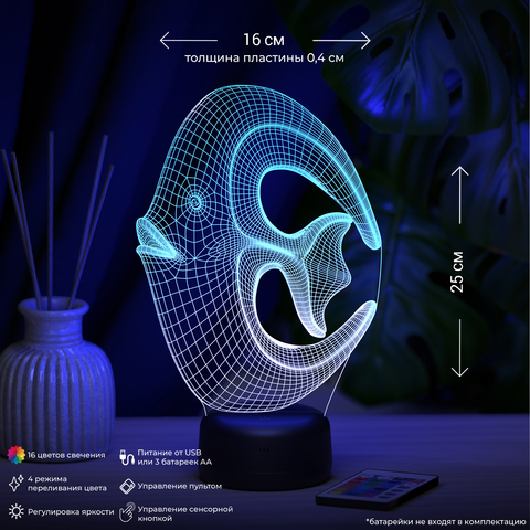 Питание: 3Д-Светильник работает от 3-х батареек АА или от USB провода. Возможна доукомплектация адаптером питания от сети 220V