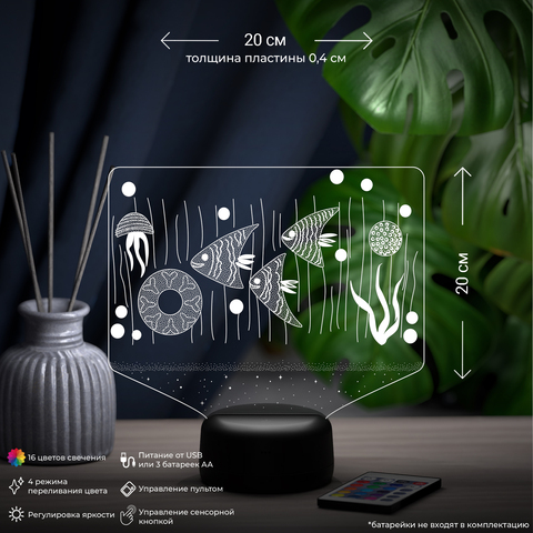 Питание: 3Д-Светильник работает от 3-х батареек АА или от USB провода. Возможна доукомплектация адаптером питания от сети 220V