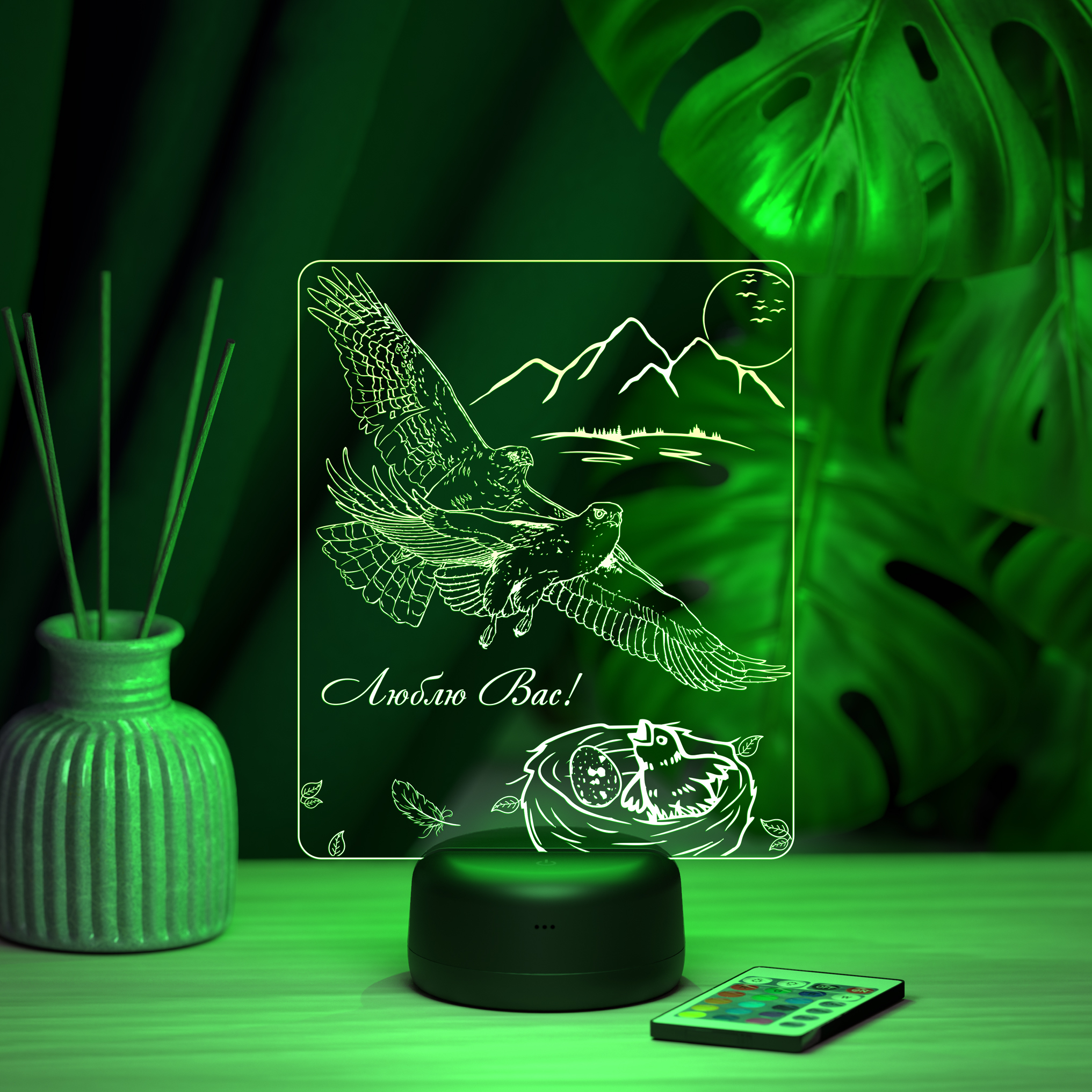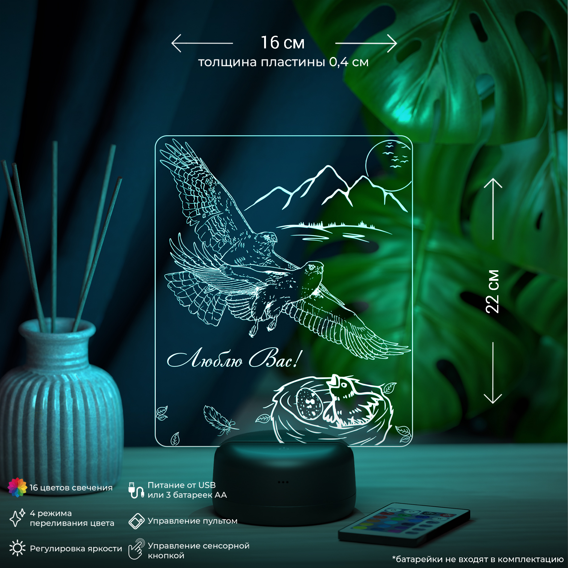 Цвета свечения: ночники имеют 16 разных режимов подсветки, регулировку яркости и 4 режима переливания цвета. Управление режимами подсветки осуществляется с помощью пульта дистанционного управления, а также прикосновением к сенсорной панели на основании светильника.