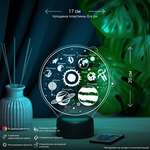Питание: 3Д-Светильник работает от 3-х батареек АА или от USB провода. Возможна доукомплектация адаптером питания от сети 220V