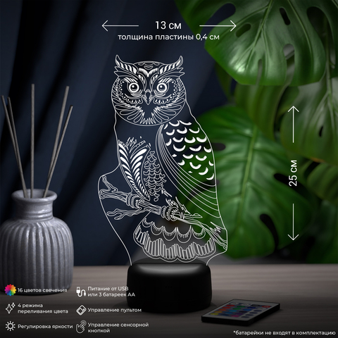 Питание: 3Д-Светильник работает от 3-х батареек АА или от USB провода. Возможна доукомплектация адаптером питания от сети 220V