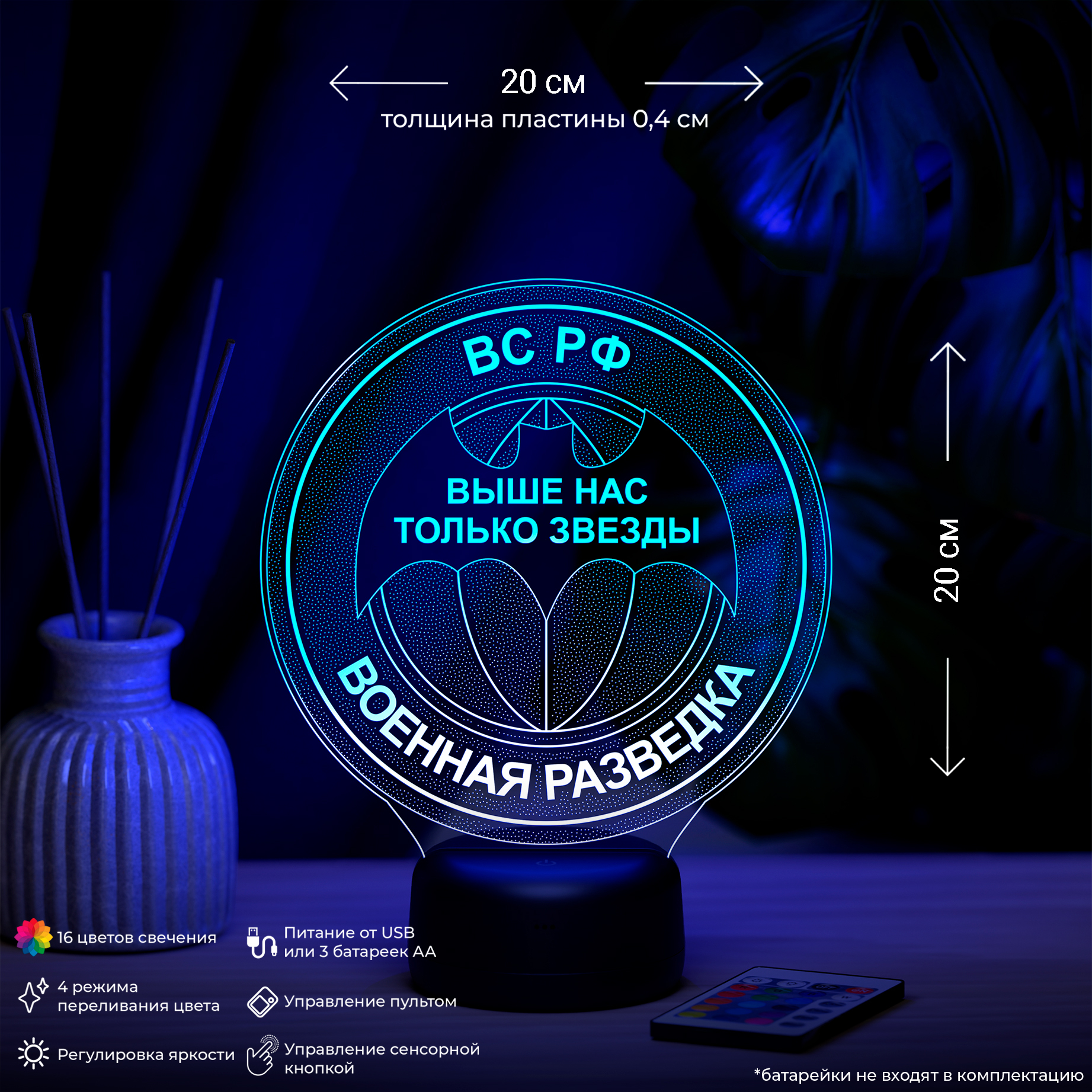 Питание: 3Д-Светильник работает от 3-х батареек АА или от USB провода. Возможна доукомплектация адаптером питания от сети 220V