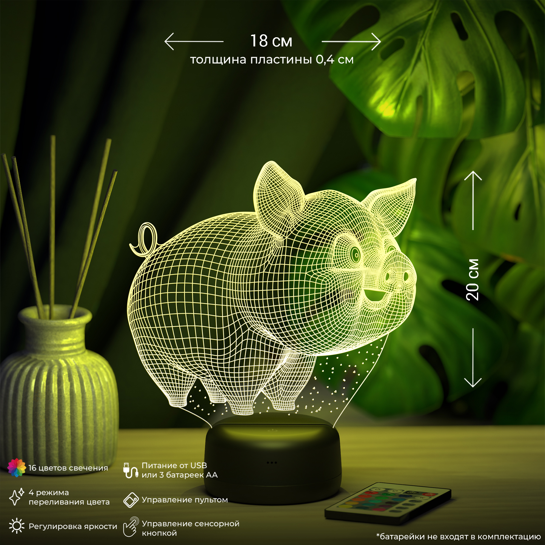 Питание: 3Д-Светильник работает от 3-х батареек АА или от USB провода. Возможна доукомплектация адаптером питания от сети 220V