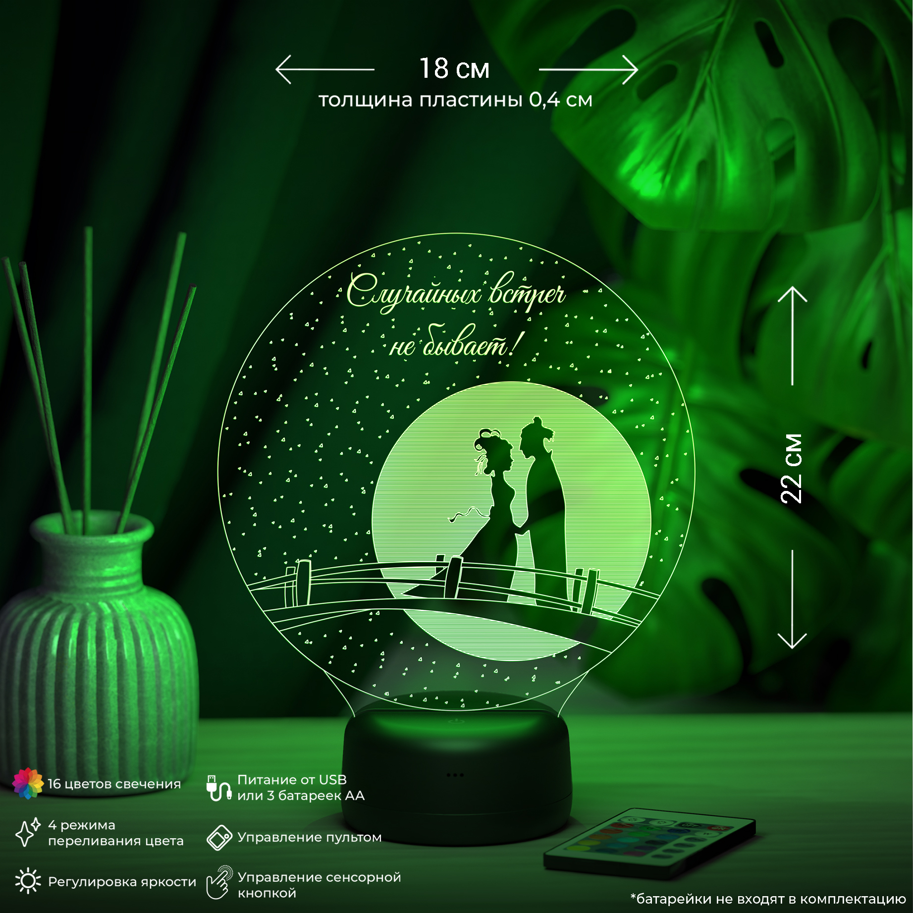 Питание: 3Д-Светильник работает от 3-х батареек АА или от USB провода. Возможна доукомплектация адаптером питания от сети 220V