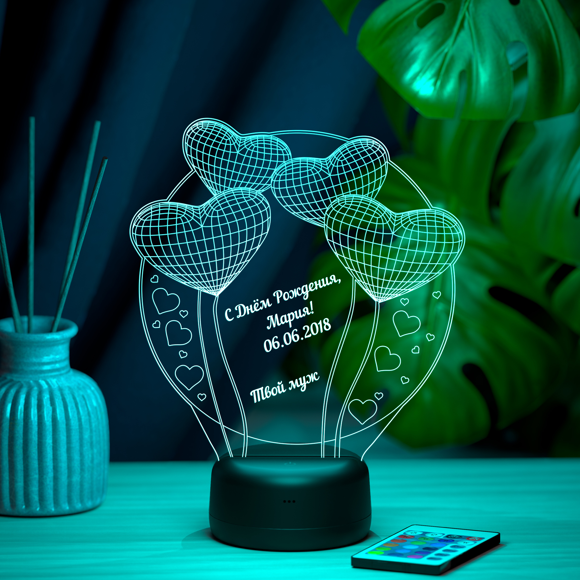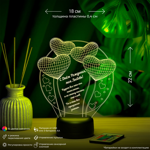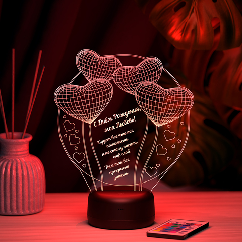 3Д-светильник "Воздушные шарики-сердечки" (Ваш текст)