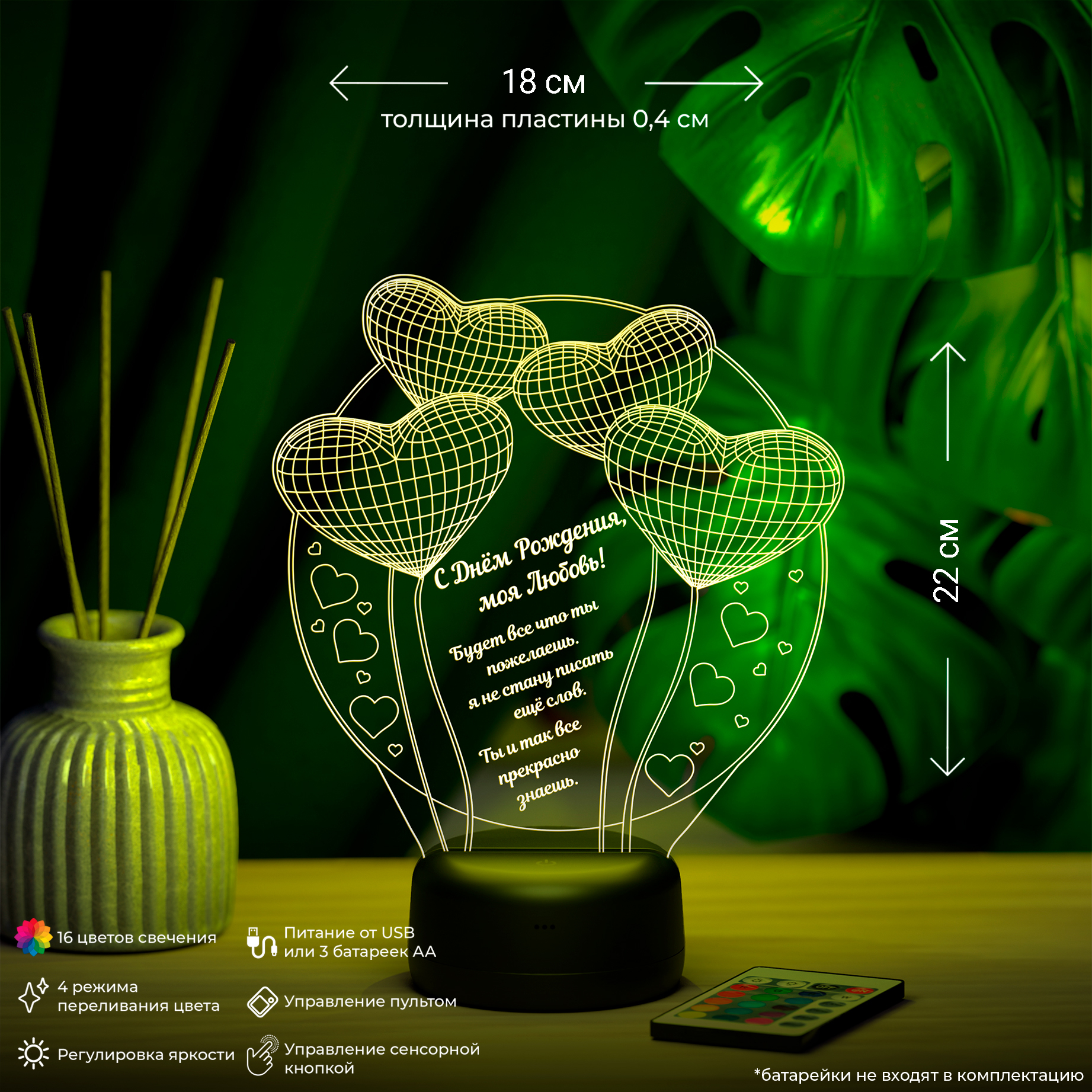 Цвета свечения: ночники имеют 16 разных режимов подсветки, регулировку яркости и 4 режима переливания цвета. Управление режимами подсветки осуществляется с помощью пульта дистанционного управления, а также прикосновением к сенсорной панели на основании светильника.
