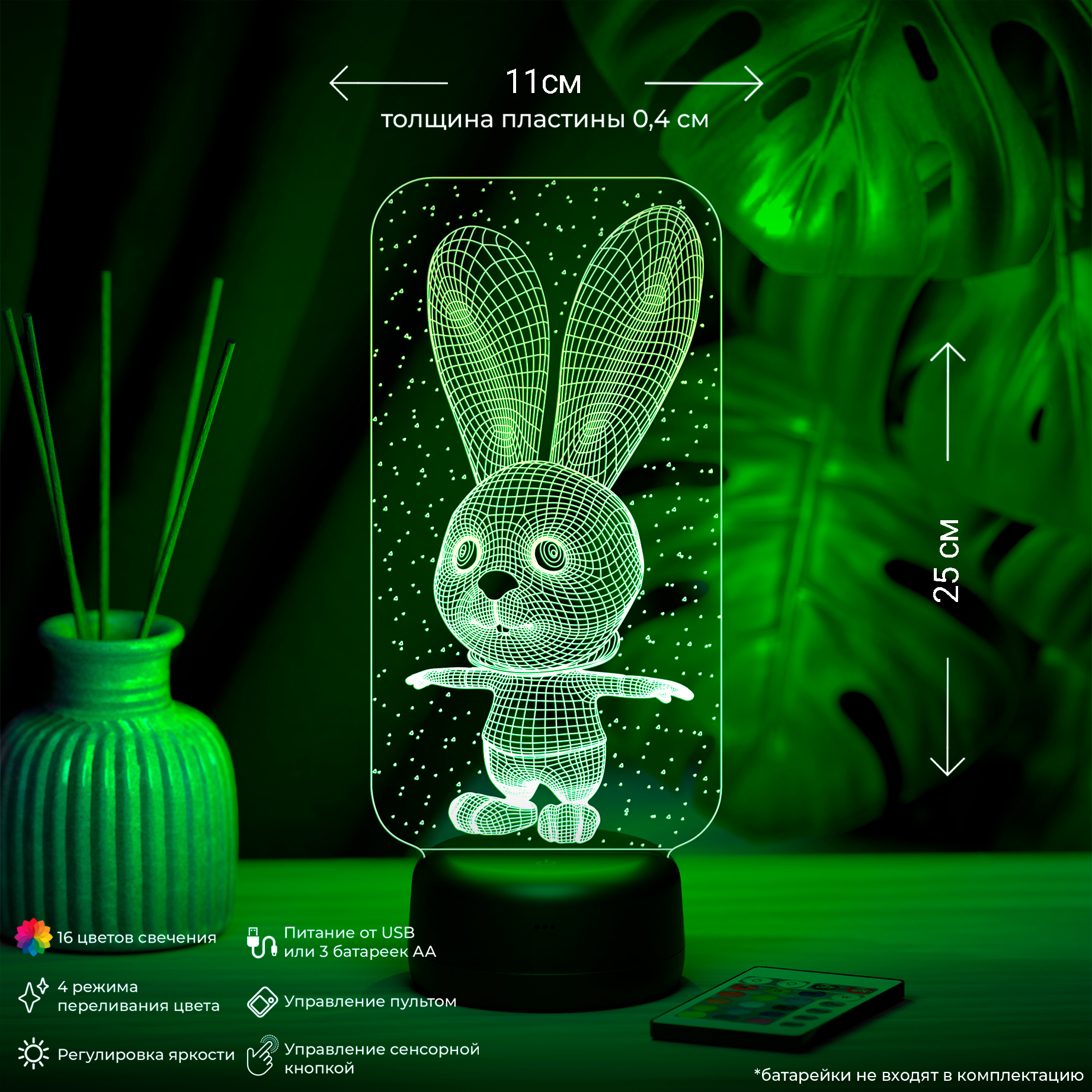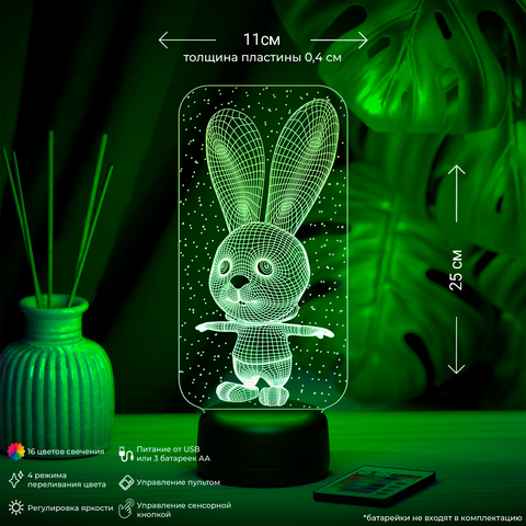 Питание: 3Д-Светильник работает от 3-х батареек АА или от USB провода. Возможна доукомплектация адаптером питания от сети 220V